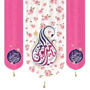 کتیبه سه عددی مخمل با شعار یا امیر المومنین طرح گل دو طرف صورتی ۱۴۰*۱۴۰