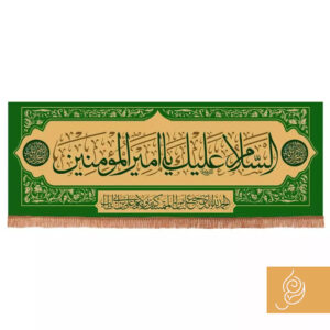 کتیبه مخمل افقی پشت منبری با شعار السلام علیک یا امیرالمومنین علیه السلام در ابعاد ۱۴۰*۲۹۰